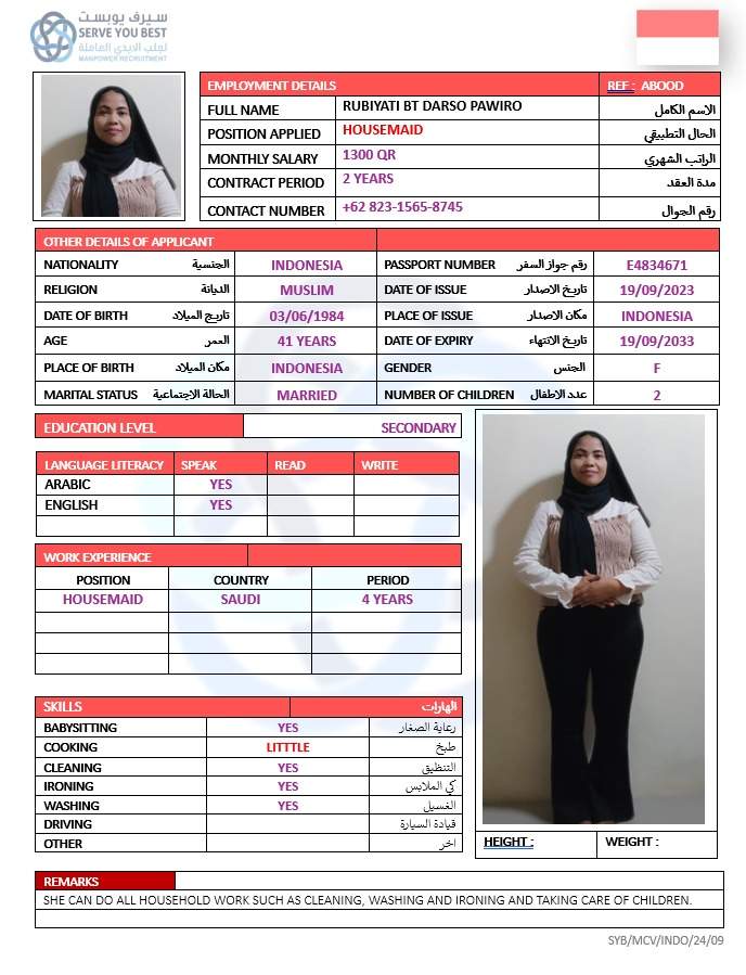 SHE IS A GOOD COOKER AND SHE HAS WORK IN SAUDI FOR 4 YEARS